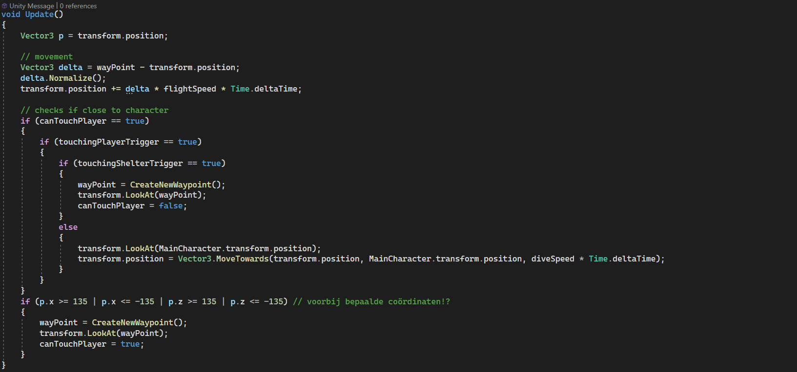 I made a dodging system to avoid the crow. This can be done when standing in one of the little shelter objects. The bird will hit a trigger telling it to retreat and follow its normal waypoints.